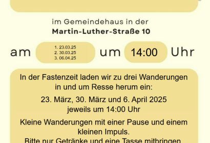Die Kapernaum-Gemeinde lädt zum Wandern in der Fastenzeit jeweils Sonntags ein. Weitere Informationen entnehmen sie bitte dem beigefügten Flyer.
